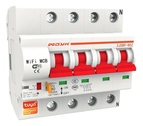 El Interruptor Automático Tuya Smart Life 4P 100A WiFi es la solución ideal para quienes buscan modernizar y optimizar su sistema eléctrico. Con un diseño compacto de 90 mm de largo, 73 mm de ancho y 86 mm de altura, este disyuntor de cuatro polos es perfecto para su instalación en rieles DIN, adaptándose a diversas configuraciones eléctricas.